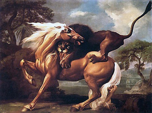 Auf diesem Gemälde des bekannten Malers Georg Stubbs – er gehörte übrigens zu den ersten Malern, die das Pferd in anatomisch korrekter Weise bzw. perfekte anatomische Darstellungen des Pferdes zeigten – wird unübersehbar deutlich, wie hilflos und wehrlos ein Pferd ist, das nicht schnell genug fliehen konnte.